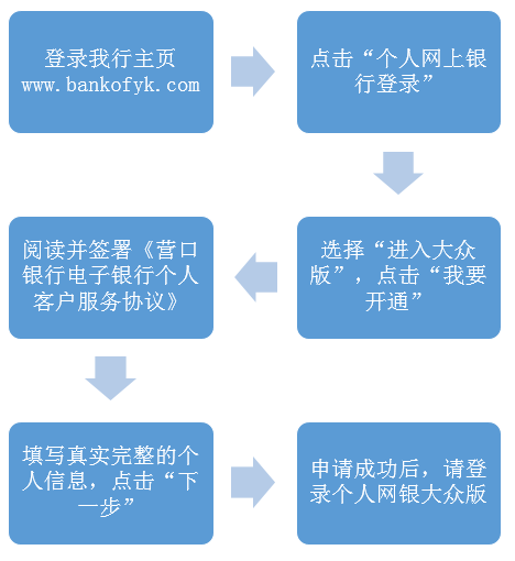 持有營(yíng)口銀行卡或存折的客戶,可以通過(guò)任意一臺(tái)連接Internet的電腦登錄m.comger.com自助注冊(cè)營(yíng)口銀行個(gè)人網(wǎng)上銀行大眾版,具體操作流程如下: ![]() |